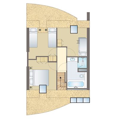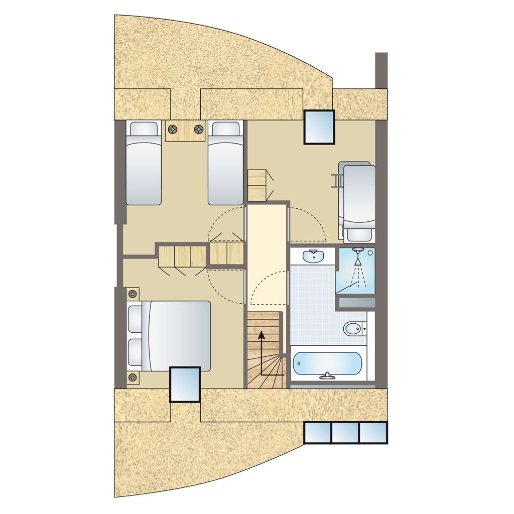 - Soveværelser med en dobelt Auping seng (dobbeltdyne) og 2-personerstopmadras på første etage
