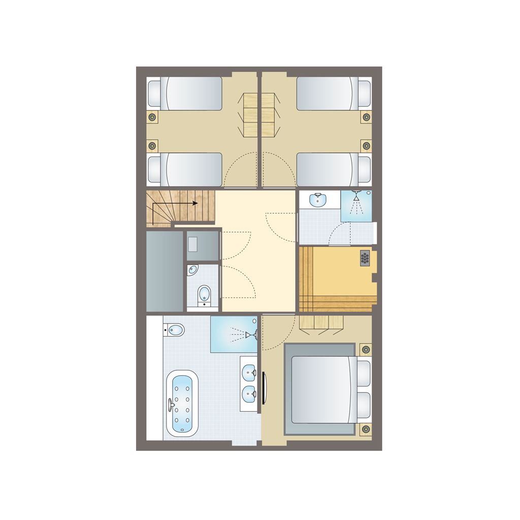 - Soveværelser med en dobelt Auping seng (dobbeltdyne) og 2-personerstopmadras på første etage
