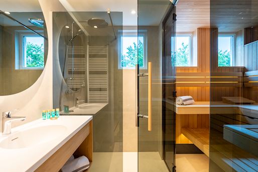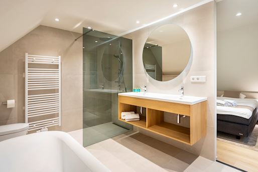 - Badeværelse med walk-in bruser med regnbruser og håndvask på første sal